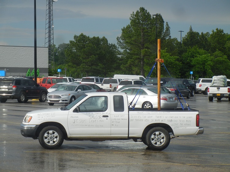 | und so erreichen wir bei einem heftigen Gewitter Harrison. Der da hat tatsächlich ein aufgestelltes Kreuz auf der Ladefläche und obskure Bibelsprüche aufs Auto geschrieben. Als der Typ dann kommt, kann ich mir den gut mit weißer Kapuze vorstellen... |