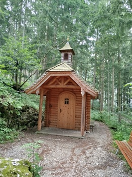| Eine Marienkirche ohne Blau, ungewöhnlich! Die Kapelle steht am Spazierweg im Wald | |