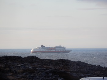 | Wir bleiben die Nacht hier stehen (ein offizieller Platz) und bekommen am Abend noch Besuch von der Polizei. Wir halten das Ganze für eine Übungskontrolle für die uniformierte Azubine - lästig, aber harmlos. Es sind halt auch viele Russen da. Am nächsten Morgen kommt die Kong Harald rein, während wir das Hotelinternet anzapfen. |