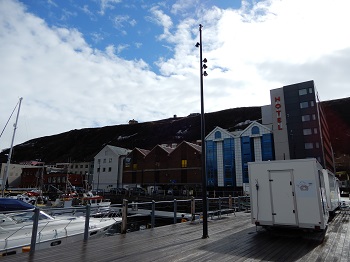| Am Morgen gönnt uns Hammerfest dann doch noch ein paar Minuten Sonne und wir machen einen Stadtbummel. Bild rechts - oben an der Kante ist der Aussichtsplatz |