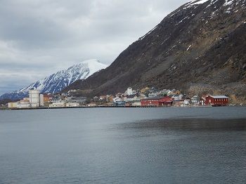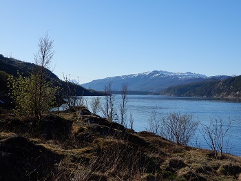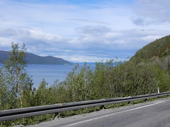| Das Ende des Meeresarmes mit einem Kraftwerk und oberhalb im Hintergrund die dunkle Linie ist die Kiruna-Erzbahn. Und siehe da, keine dicke Jacke mehr!!! |