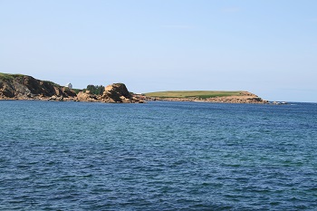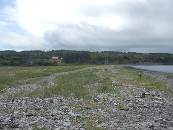 | Eine lange Schotterbank reicht an den Strait of Canso und ist Seeweg |
