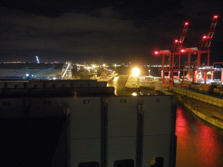 | Bei dem hellen Scheinwerfer ist die Schleuse und sie ist noch zu. Der höchste Tidenstand ist erst um Mitternacht. Das dauert uns dann doch zu lange und wir gehen alle ins Bett |