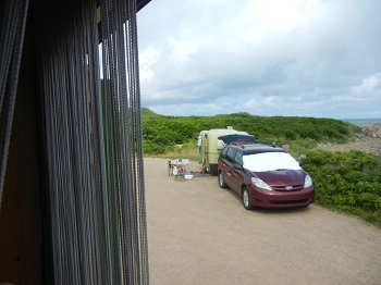| Ein ständiges Kommen und Gehen und meist ein bißchen Smalltalk, manchmal sogar mit Deutschen. In dem kleinen Wohnwagen ist eine vierköpfige Familie aus Alberta unterwegs |