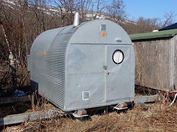 | Neben uns steht ein Wohnwagen mit Kufen. Beim Morgenrundgang sehe ich kleine Hütten |