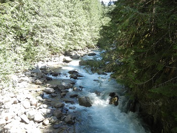 | Der North Cascades HWY war im Winter geschlossen. Das Wasser ist hier nur noch in kleinen Gumpen vorhanden, weil oben der nächste Stausee ist | ||